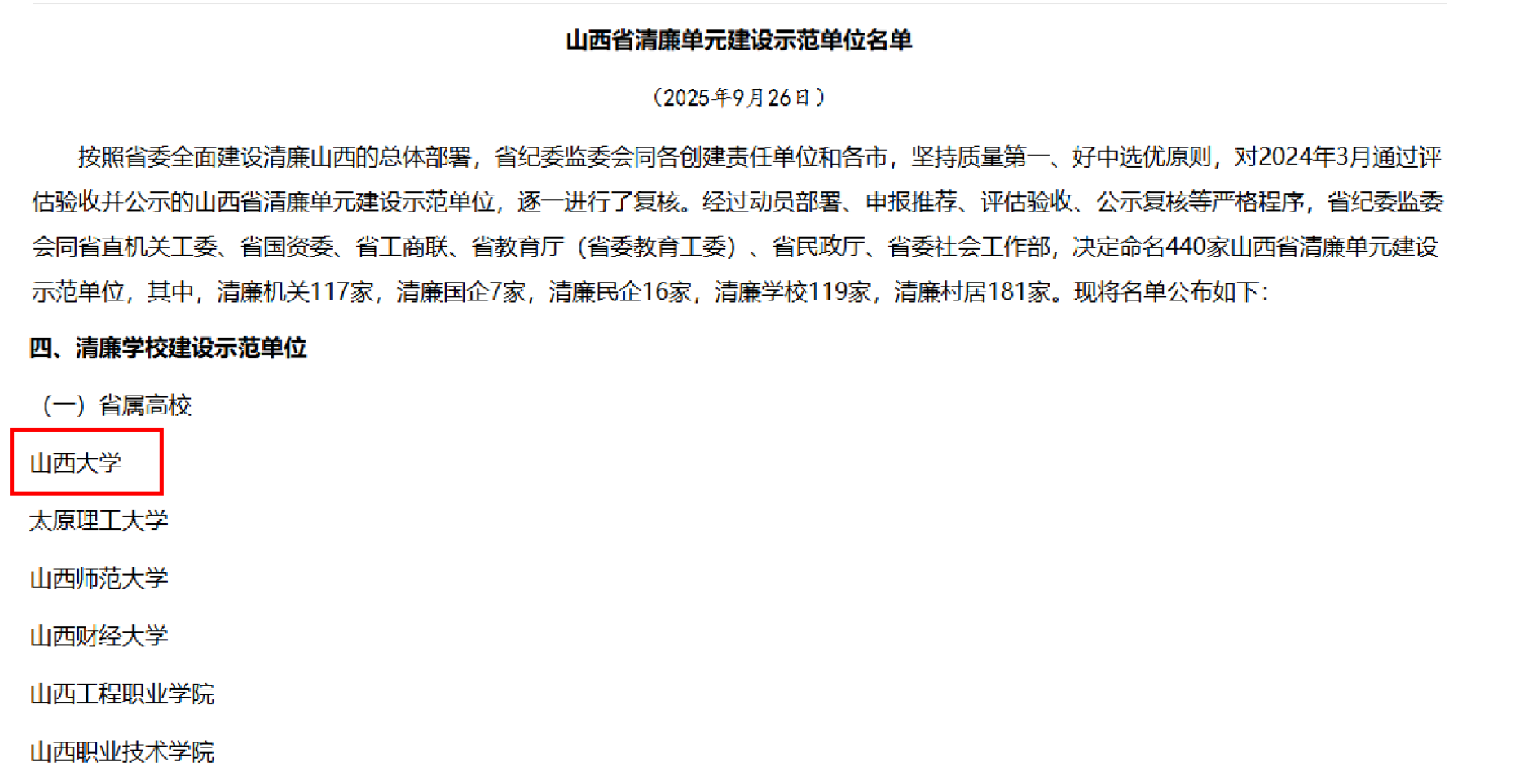 根据省委全面建设清廉山西的总体部署,省纪委监委会同各创建责任单位和各市,坚持质量第一、好中选优原则,对2024年3月通过评估验收并公示的山西省清廉单元建设示范单位,逐一进行了复核。经过动员部署、申报推荐、评估验收、公示复核等严格程序,省纪委监委会同省直机关工委、省国资委、省工商联、省教育厅(省委教育工委)、省民政厅、省委社会工作部,决定命名440家山西省清廉单元建设示范单位。我校荣列其中,并作为22家单位之一,在现场接受授牌。