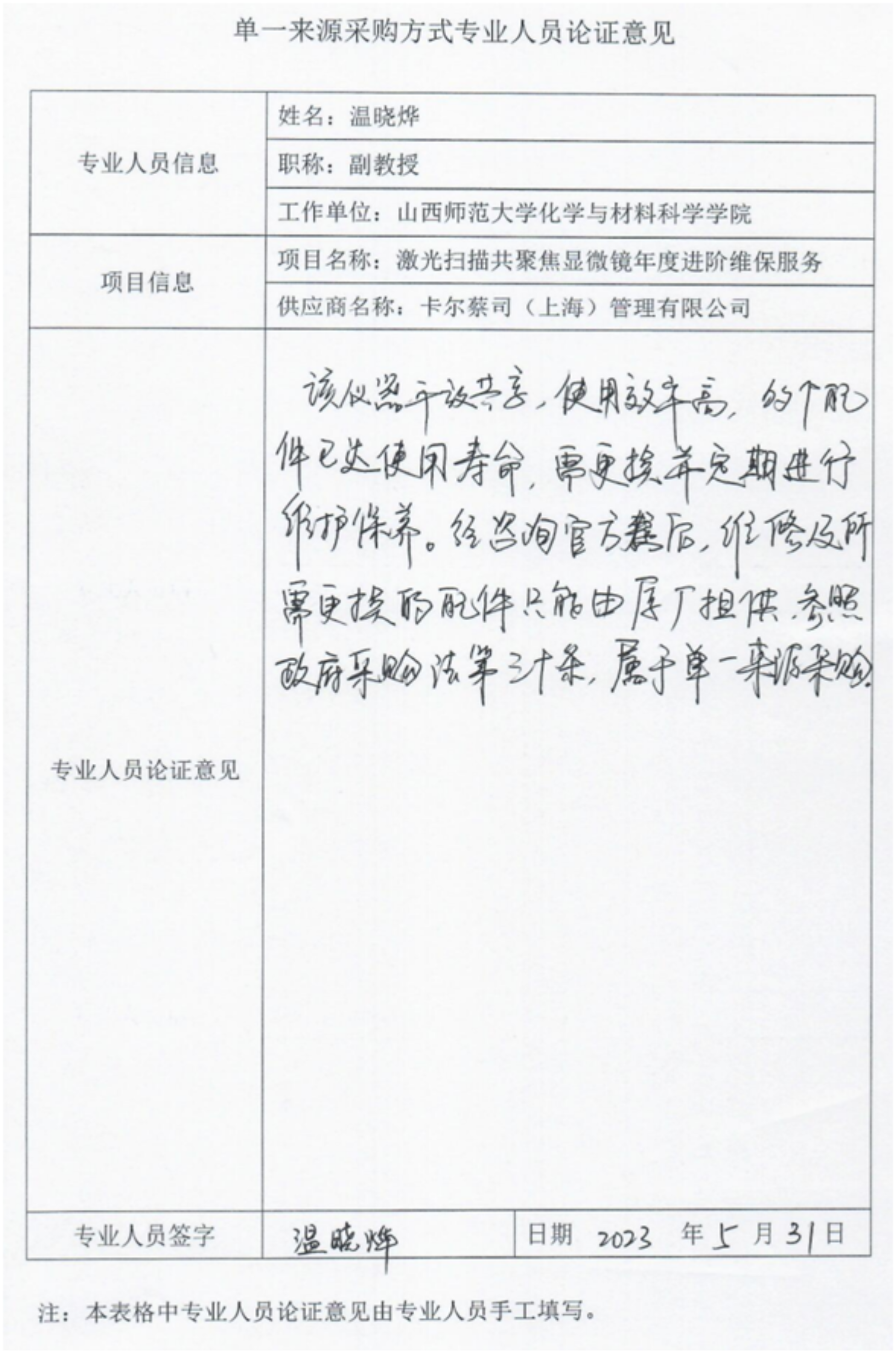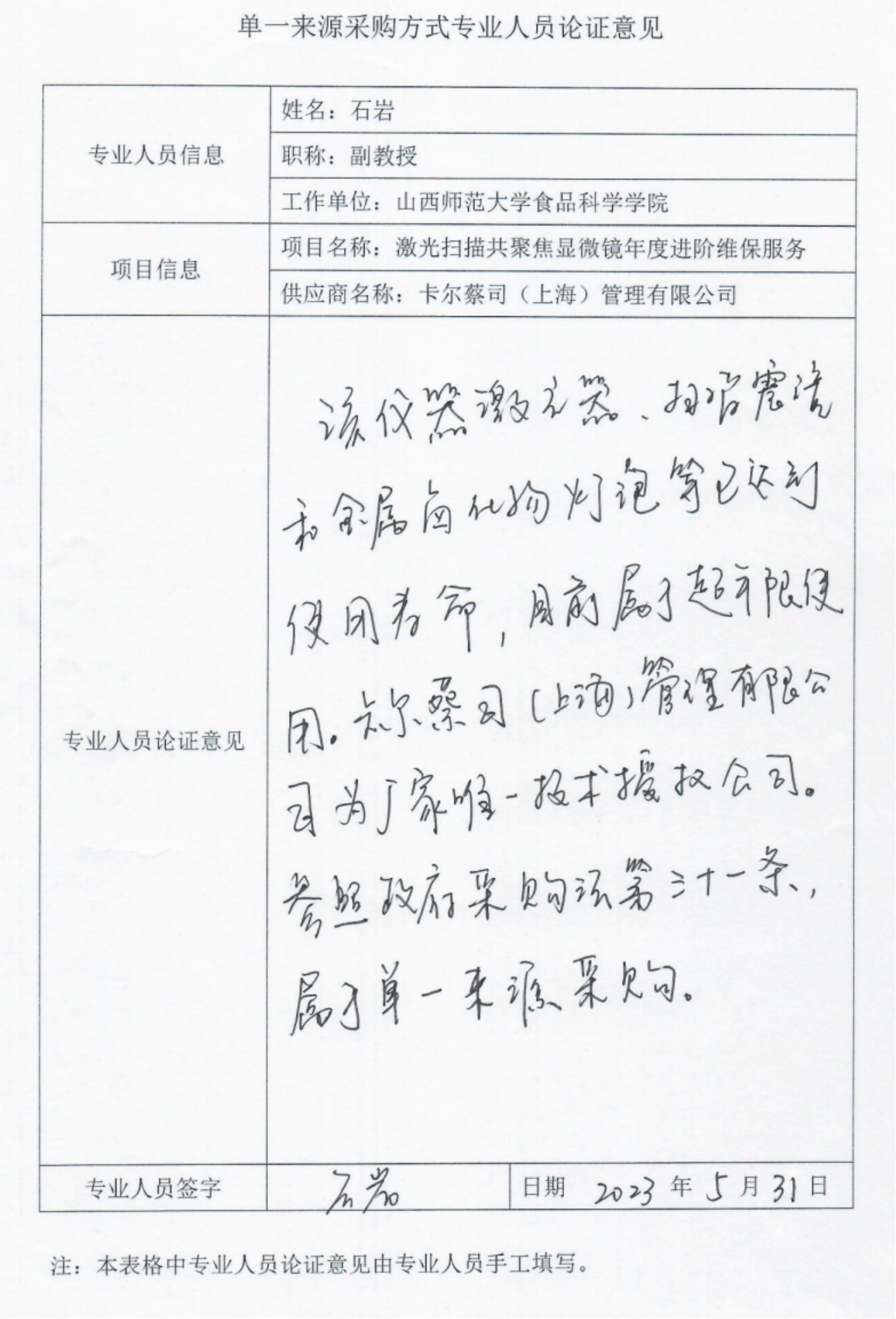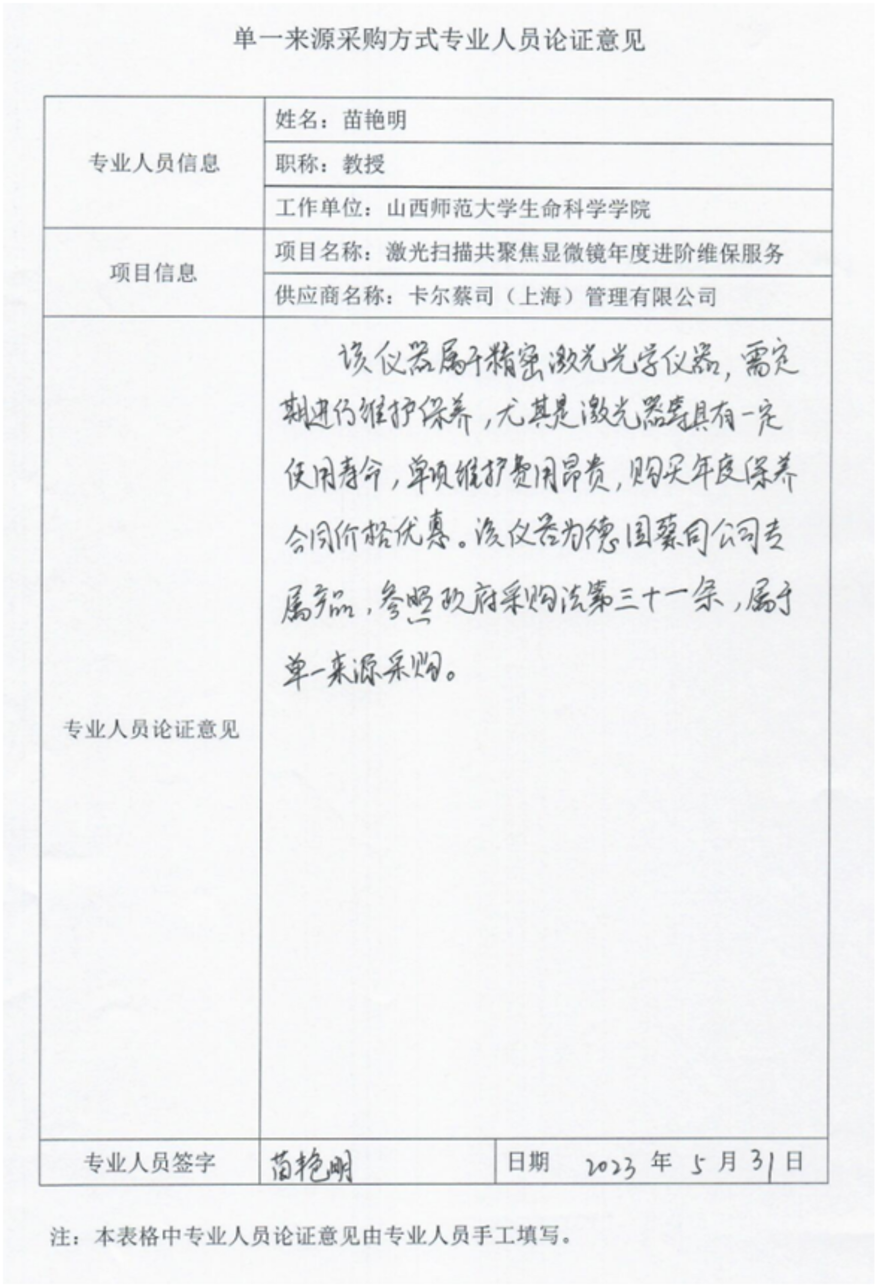 采用单一来源采购方式的原因及说明:安博平台大型科学仪器中心使用的激光共聚焦显微镜是德国蔡司公司专属产品,经咨询官方售后卡尔蔡司(上海)管理有限公司,维修所需配件只能使用原厂提供的,且该公司为厂家唯一技术授权公司。该产品采购符合我国采购法关于单一来源采购要求,申请此项目以单一来源方式采购。