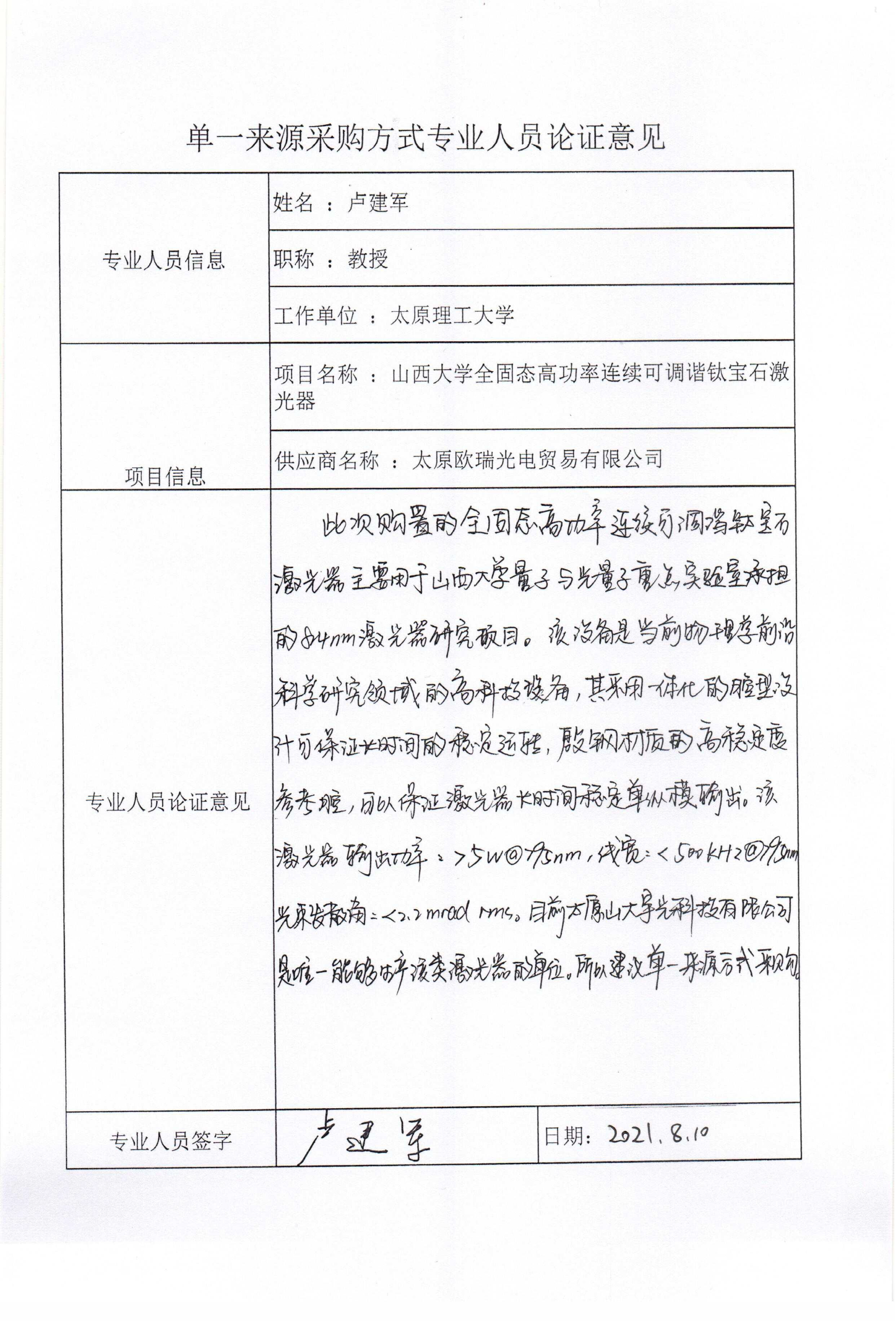 采用单一来源采购方式的原因及说明:目前满足上述技术参数的全固态高功率连续可调谐钛宝石激光器,只有太原山大宇光科技有限公司可以生产,太原欧瑞光电贸易有限公司是太原山大宇光科技有限公司在中国此项目的唯一代理商,因此,申请以单一来源方式采购。