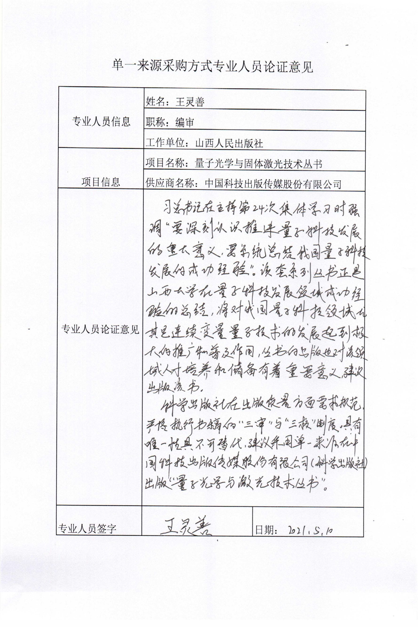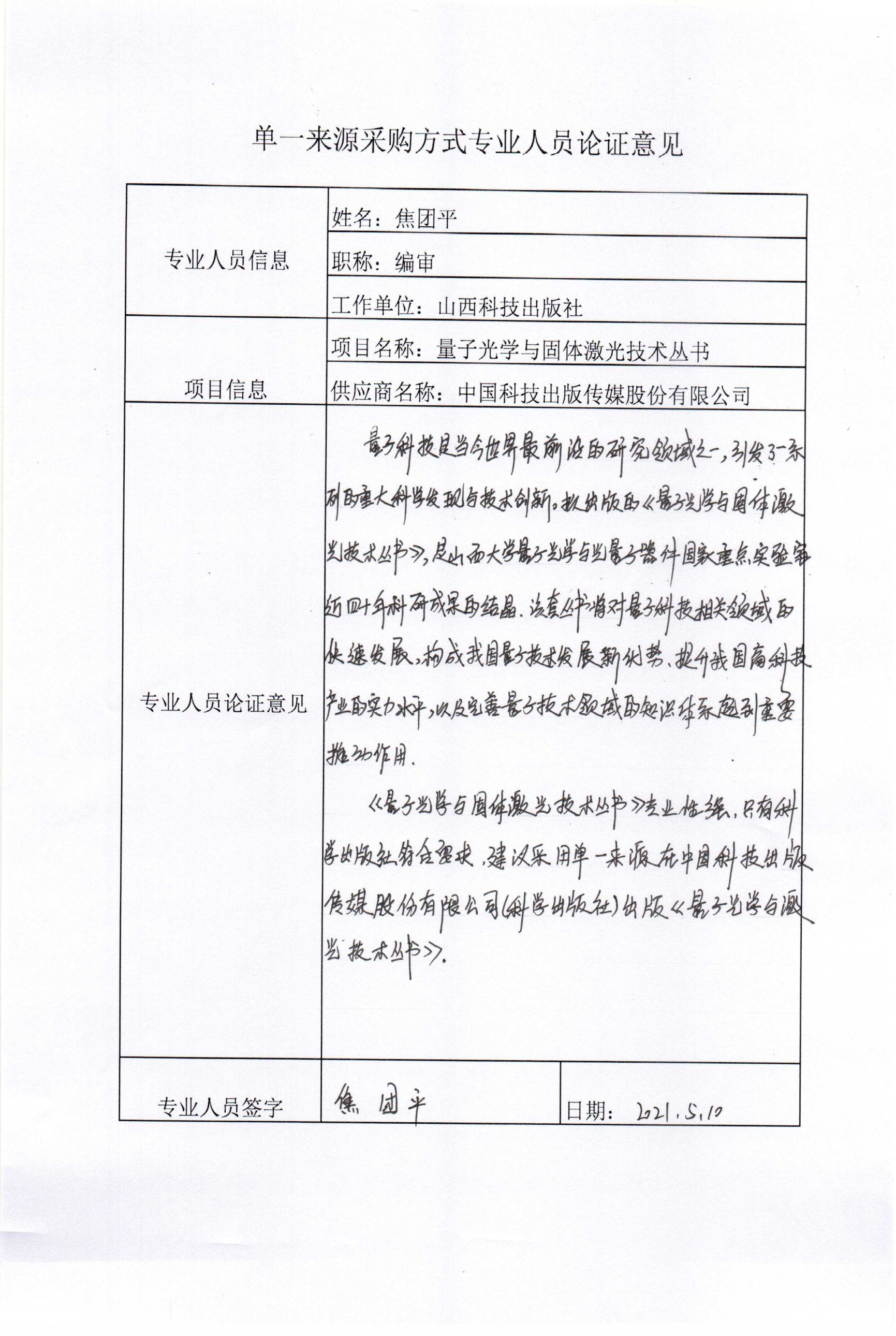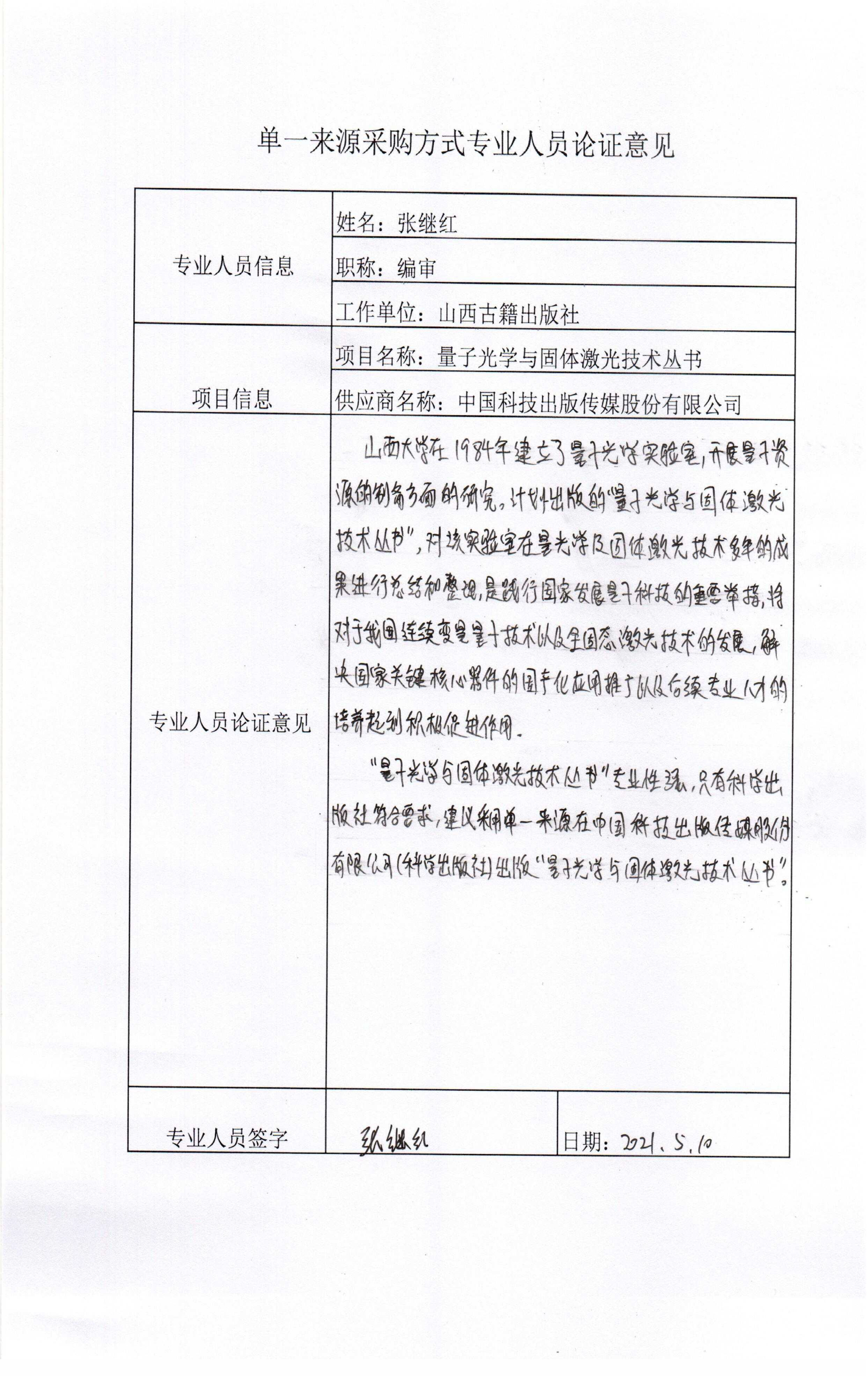 单位会商和专家论证意见:经安博平台光电研究所领导、科研人员调研,聘请校外专家进行详细的论证,“量子光学与固体激光技术丛书”的出版符合我国采购法关于单一来源采购的要求,申请此项目以单一来源方式采购。