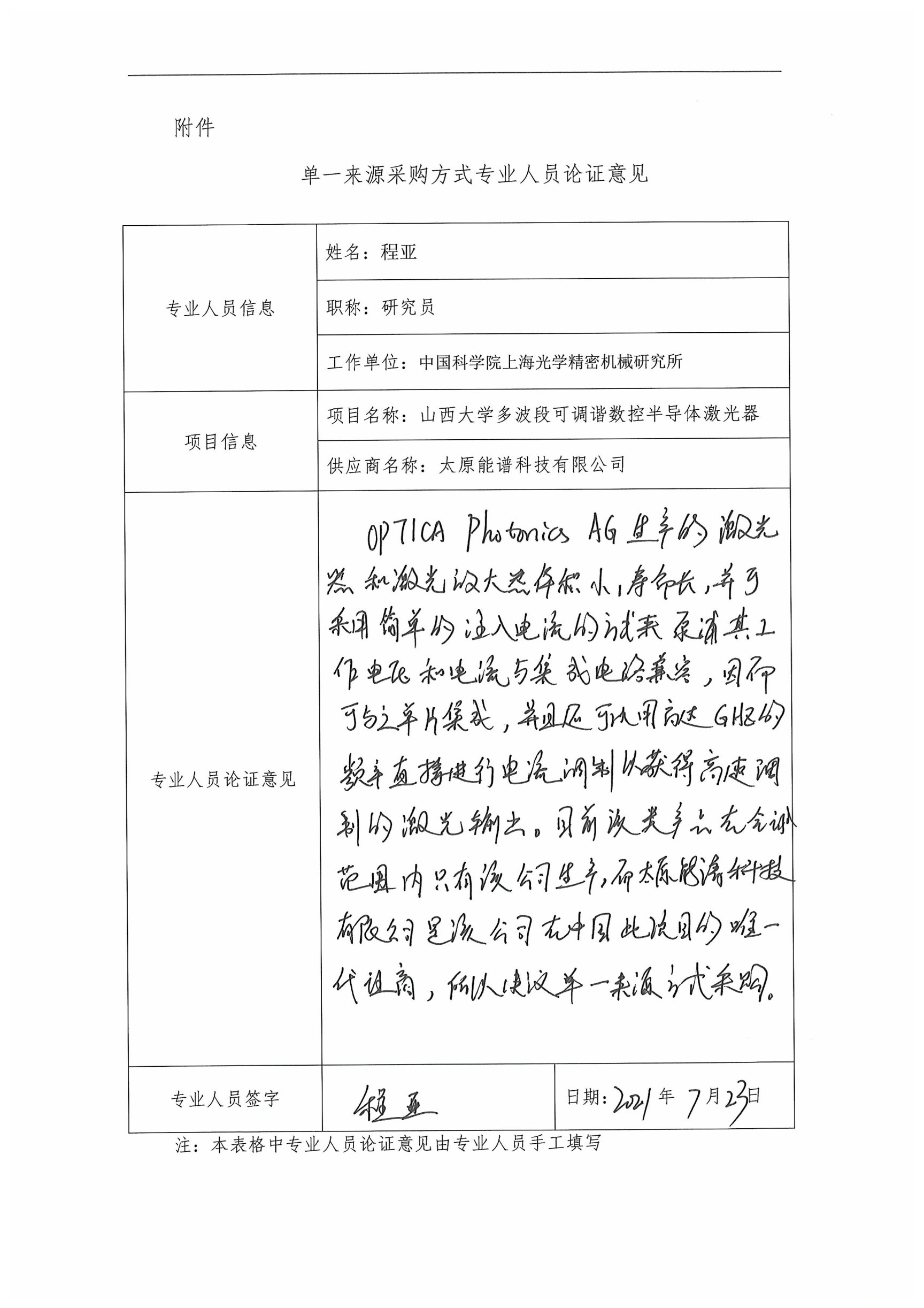 采用单一来源采购方式的原因及说明:目前,能满足实验技术要求的多波段可调谐数控半导体激光器只有德国TOPTICA Photonics AG生产,太原能谱科技有限公司是德国TOPTICA Photonics AG公司在中国此项目的唯一代理商,因此,申请以单一来源方式采购。