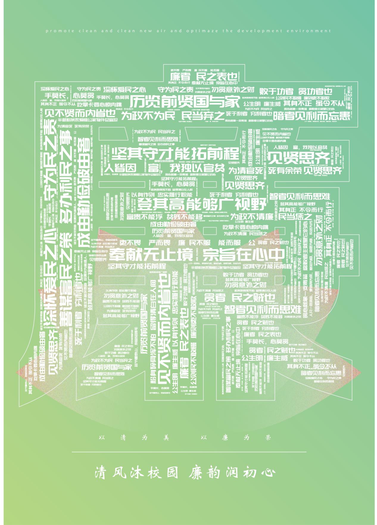画面中心是清初名臣于成龙的全身像,临近全身画的文字以书法形式表达了于成龙的廉洁。于成龙的全身像以黑白木刻贴合画面主体,更容易衬托人物廉吏天下第一的形象,以竹子修饰画面边缘,呼应画面右下的“欲影正者端其表”,表达了做人应该清正廉洁。底色为蜜色,以茶色纹理和大红色块做画面拼接,最上方的“清正廉洁”突出主旨。右下方“清风沐校园,廉韵润初心”深化活动主题。