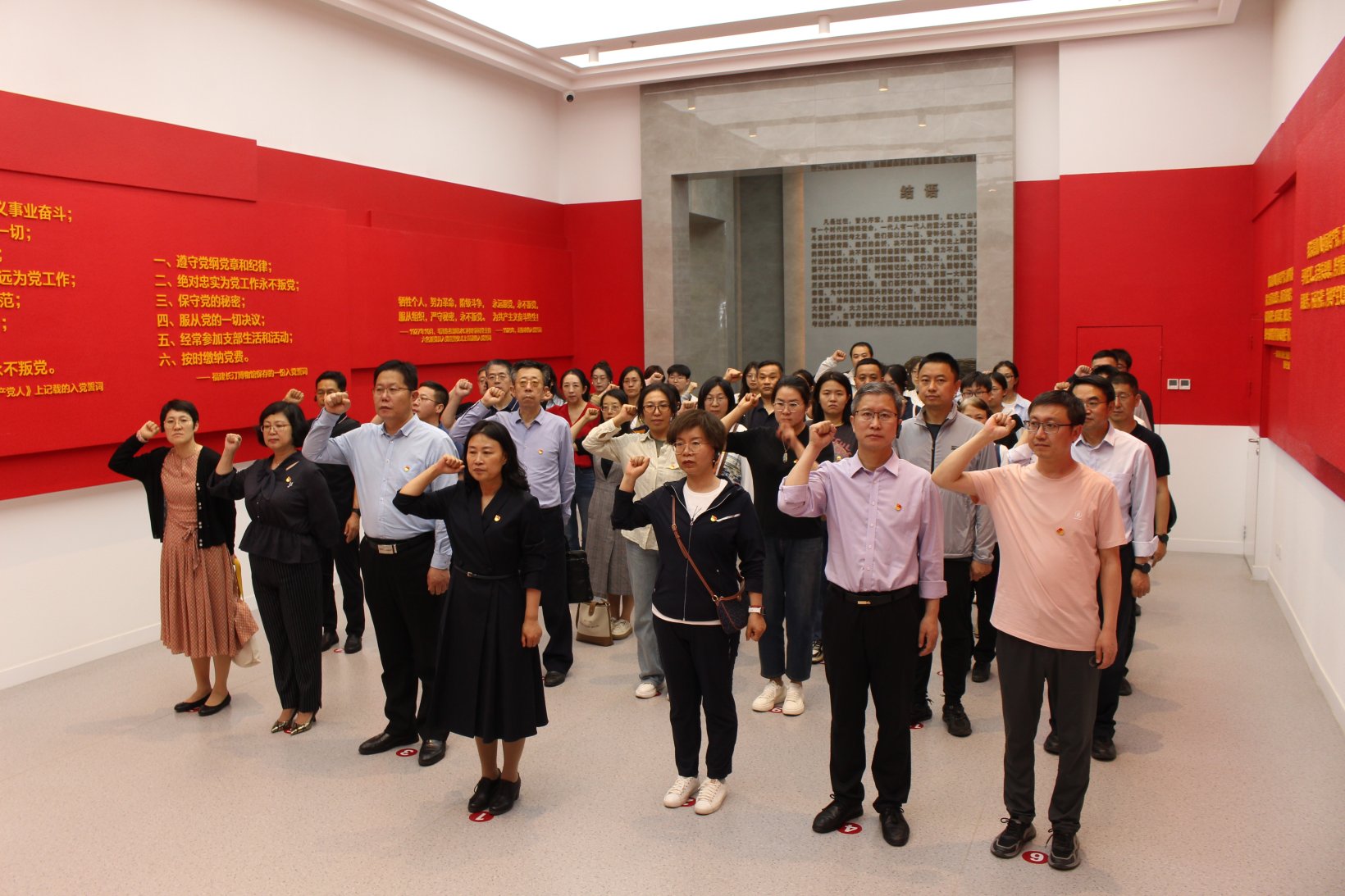 参观结束后,在宣誓厅鲜红的党旗下,全体党员高举右拳,庄严宣誓,重温入党誓词。