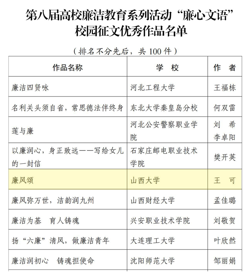 近日,教育部办公厅印发《关于公布第八届高校廉洁教育系列活动结果的通知》,我校3项作品入选教育部第八届高校廉洁教育系列活动优秀作品名单。其中,文学院副教授侯姝慧的《山西清官廉吏文化资源与大学生廉洁文化教育示范课堂建设》入选案例展示优秀作品名单;考古文博学院学生王可的《廉风颂》入选“廉心文语”校园征文优秀作品名单;法学院学生刘政、牛旭斌、粱健、王媛媛的作品《足迹》入选“润心话语”视频征集优秀作品名单。