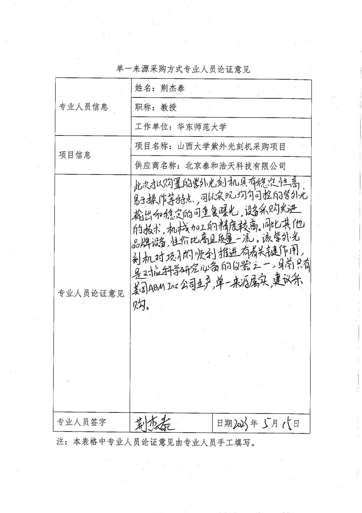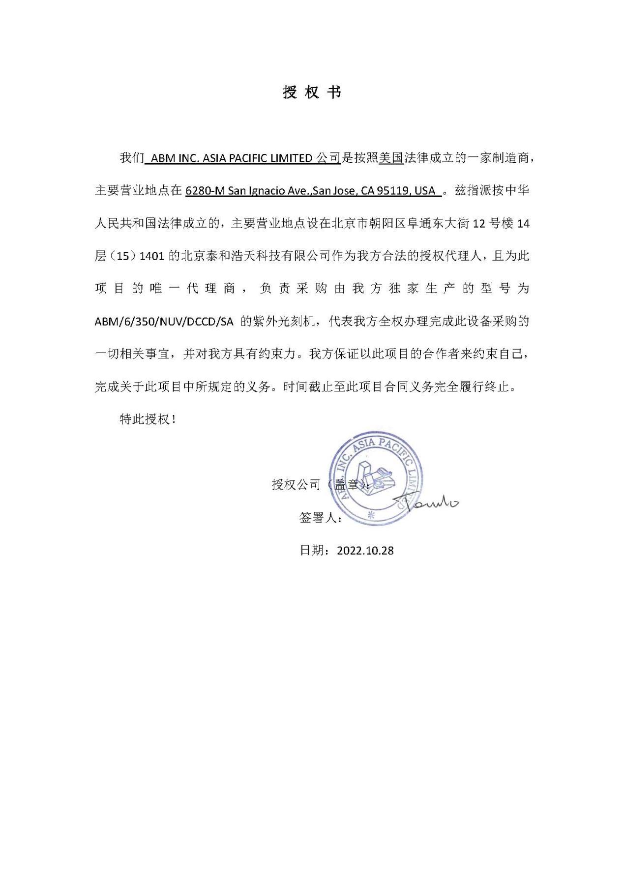 采用单一来源采购方式的原因及说明:目前满足上述参数的紫外光刻机,只有美国ABM Inc公司生产,北京泰和浩天科技有限公司是美国ABM Inc公司在中国此项目授权的唯一代理商,因此,申请以单一来源方式采购。
