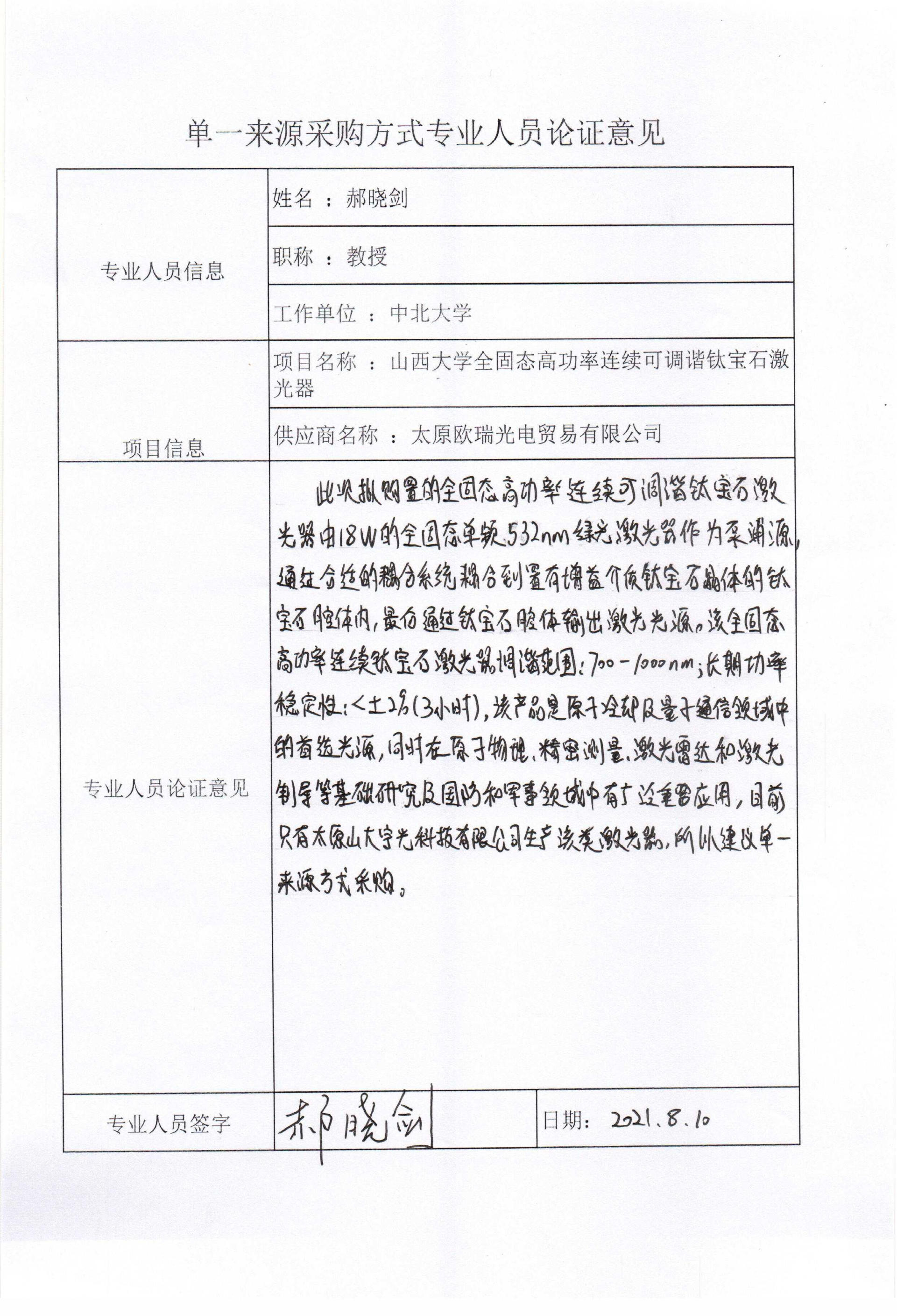 采用单一来源采购方式的原因及说明:目前满足上述技术参数的全固态高功率连续可调谐钛宝石激光器,只有太原山大宇光科技有限公司可以生产,太原欧瑞光电贸易有限公司是太原山大宇光科技有限公司在中国此项目的唯一代理商,因此,申请以单一来源方式采购。