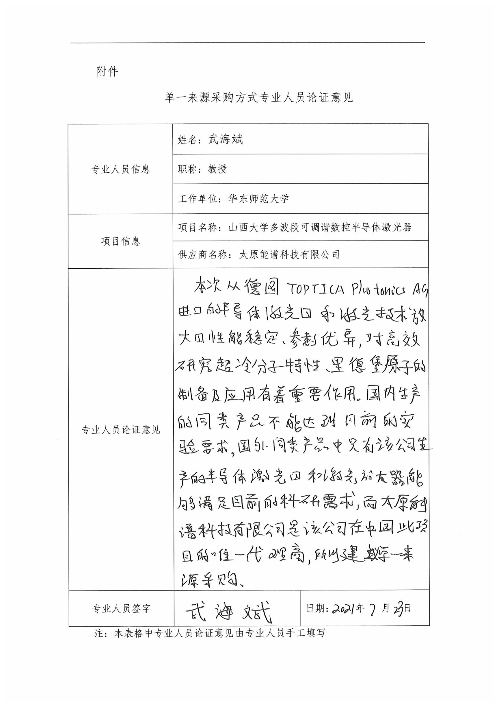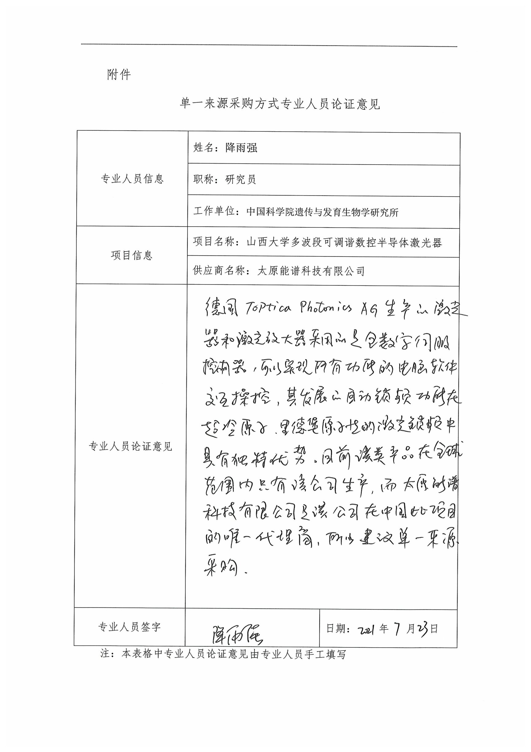 采用单一来源采购方式的原因及说明:目前,能满足实验技术要求的多波段可调谐数控半导体激光器只有德国TOPTICA Photonics AG生产,太原能谱科技有限公司是德国TOPTICA Photonics AG公司在中国此项目的唯一代理商,因此,申请以单一来源方式采购。